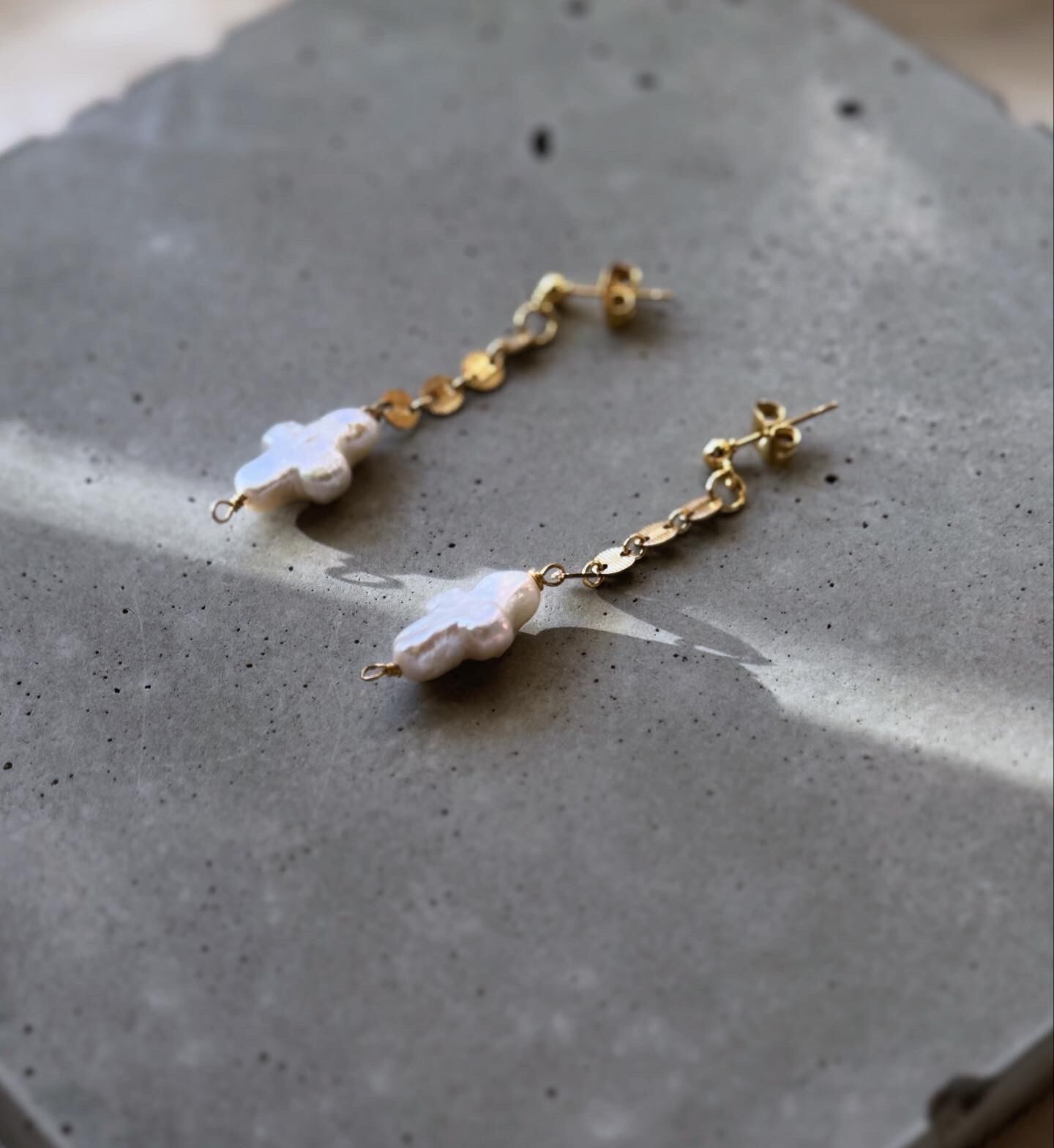 ゆるやかなクロスのかたちをした、淡水パールのピアス。